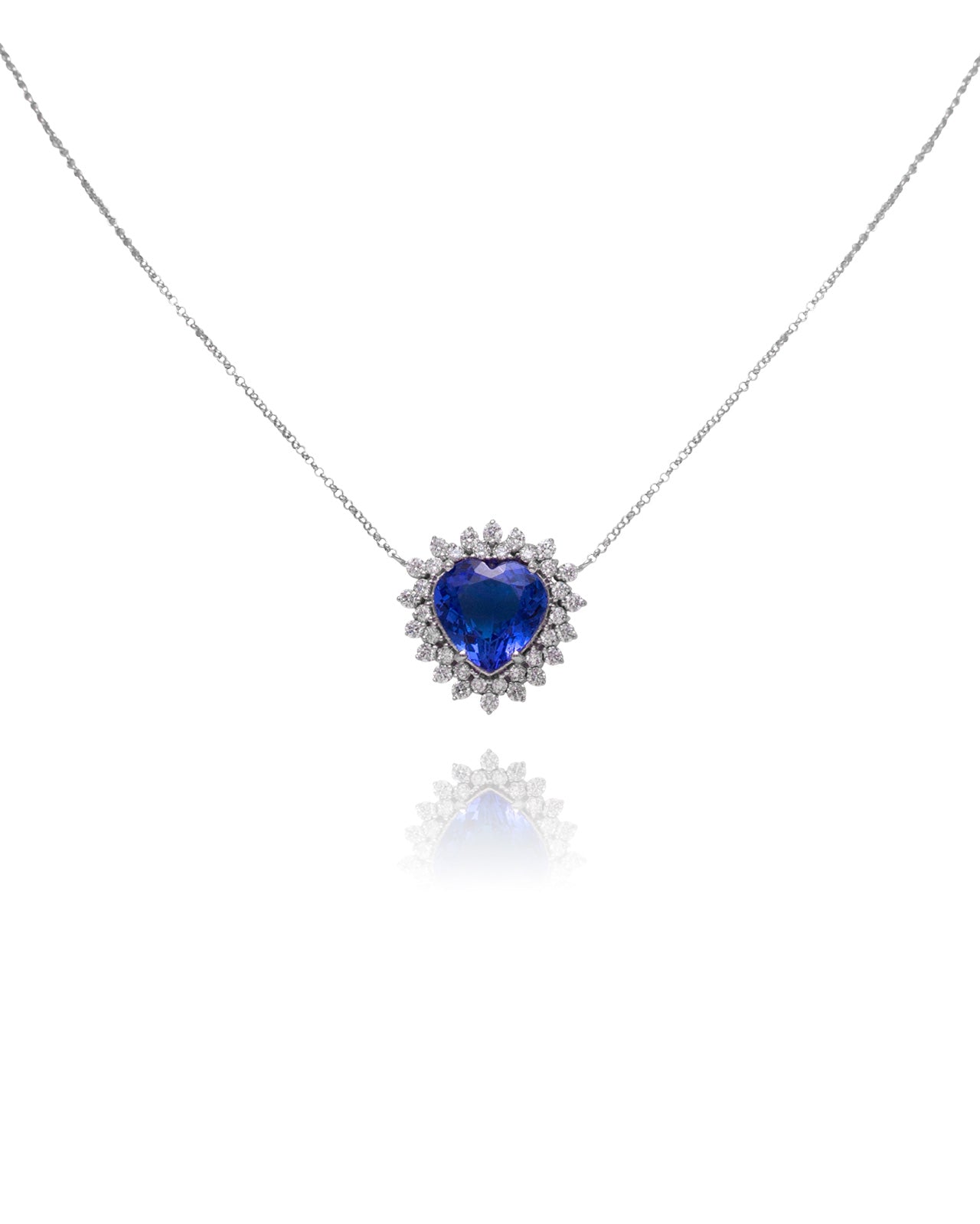 Colar em ouro branco 18K com Tanzanita central lapidada em formato coração e diamantes naturais, totalizando 5.35 quilates, sendo 4.6 ct de tanzanita e 0.75 ct de brilhantes. Uma joia romântica e sofisticada que destaca a beleza da tanzanita, cuja tonalidade azul-violeta intensa cria um contraste delicado com o brilho luminoso dos diamantes.