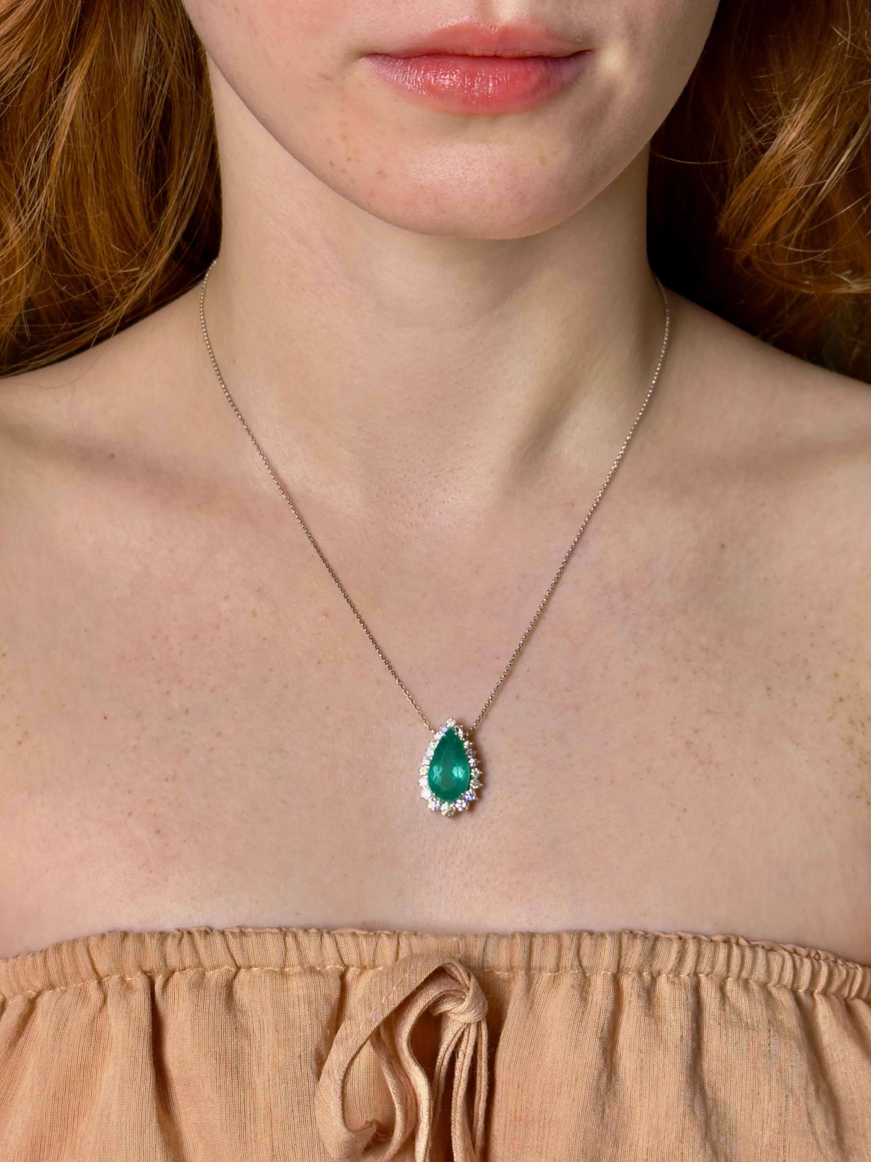 Esta peça premium da Suria Jewelry combina uma gema central em esmeralda corte gota de aproximadamente 5,2 quilates, acompanhada por 1 quilate de brilhantes cuidadosamente selecionados. O metal em ouro branco 18 K confere durabilidade e sofisticação. Ideal para eventos marcantes ou para ser a joia-chave no seu estilo com um toque de luxo.