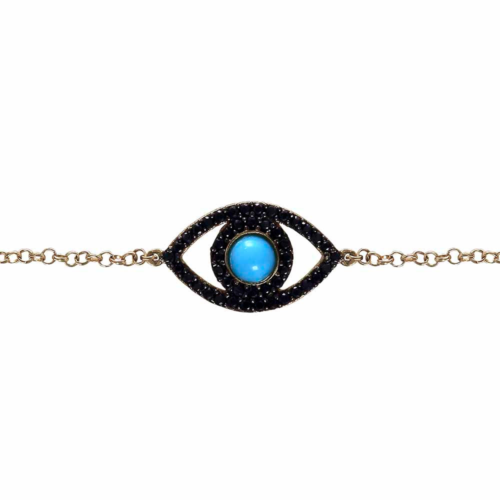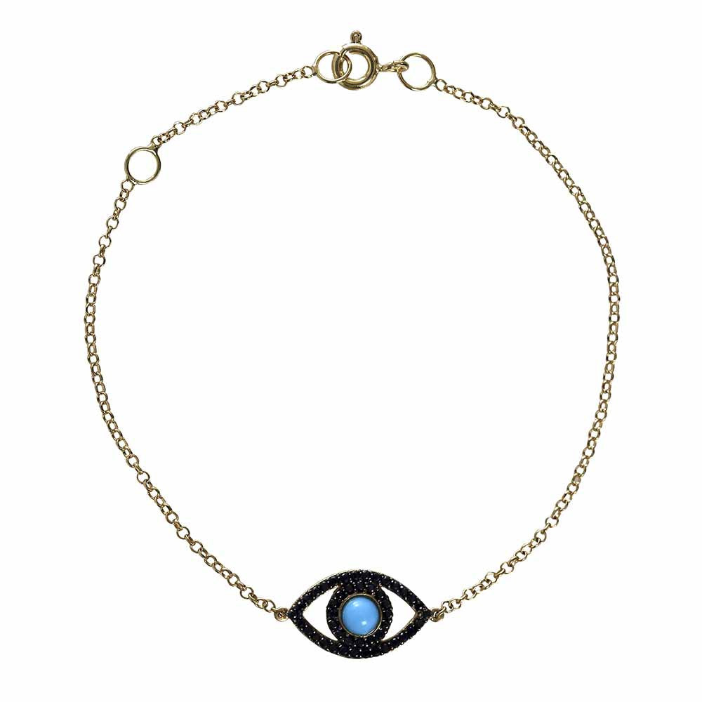 OLHO GREGO OURO TURQUESA COM SAFIRAS NEGRAS